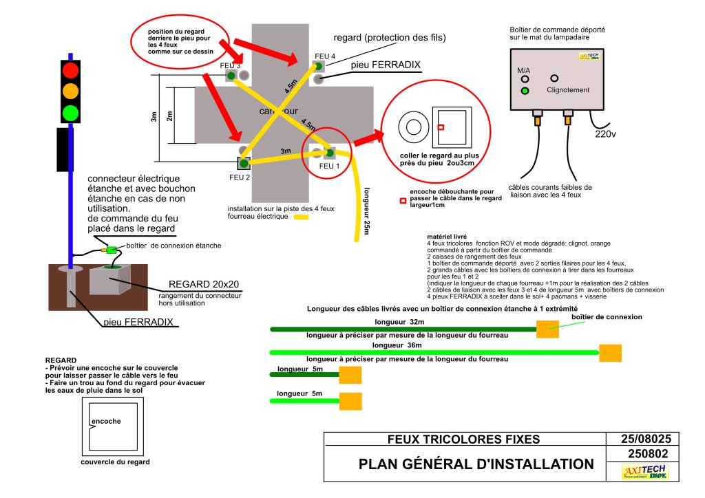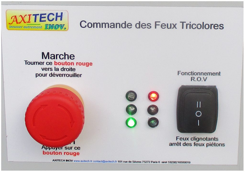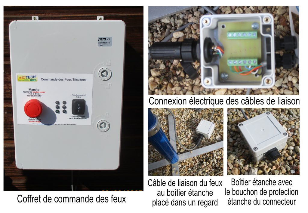 Les feux tricolores sont placés sur la piste de façon permanente mais démontable occasionnellement. Ils sont commandés par un coffret déporté à plusieurs dizaines de mètres et qui regroupe: l’alimentation 220v, la mise en route et l’arrêt par un bouton d’arrêt d’urgence, la sélection du mode de fonctionnement: ROV ou clignotement orange (mode dégradé), une visualisation du fonctionnement des feux par 6 leds rouges oranges vertes simulant les feux.